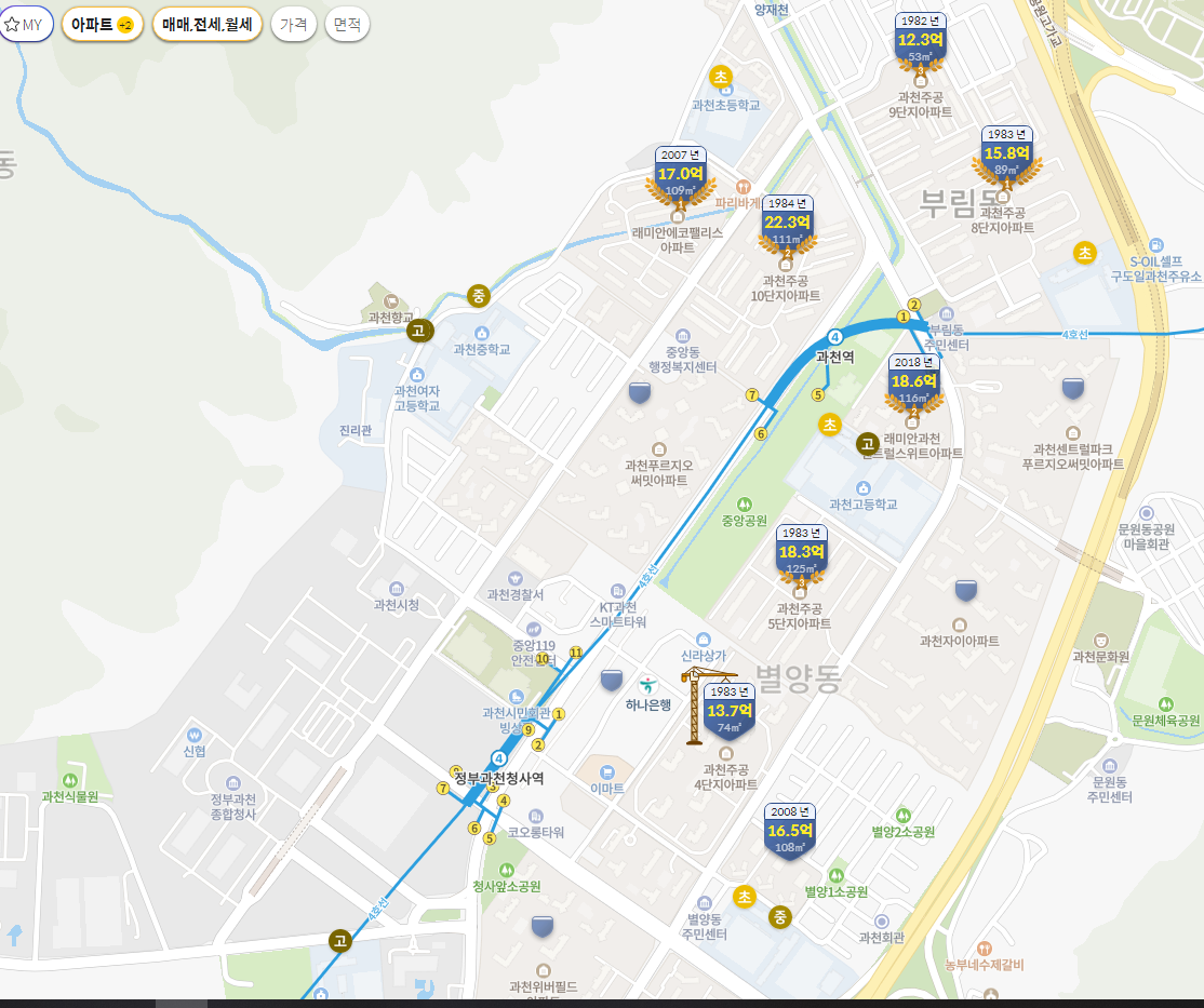 그렇다면 과천 주택가는 어떨까요. 주요 지역은 크게 아래와 같습니다.
